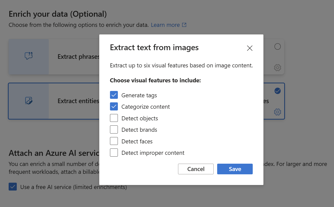 下一步是配置 AI 扩充以调用 OCR、图像分析和实体识别。
