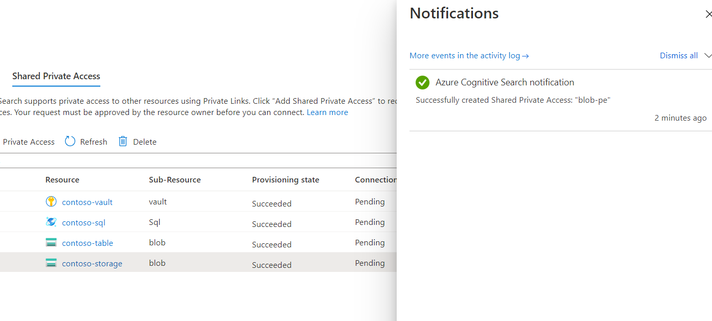 在 Azure AI 搜索端,可以通过重新访问搜索服务“网络”页的“共享专用访问”页来确认请求批准状态。 连接状态应为“已批准”。