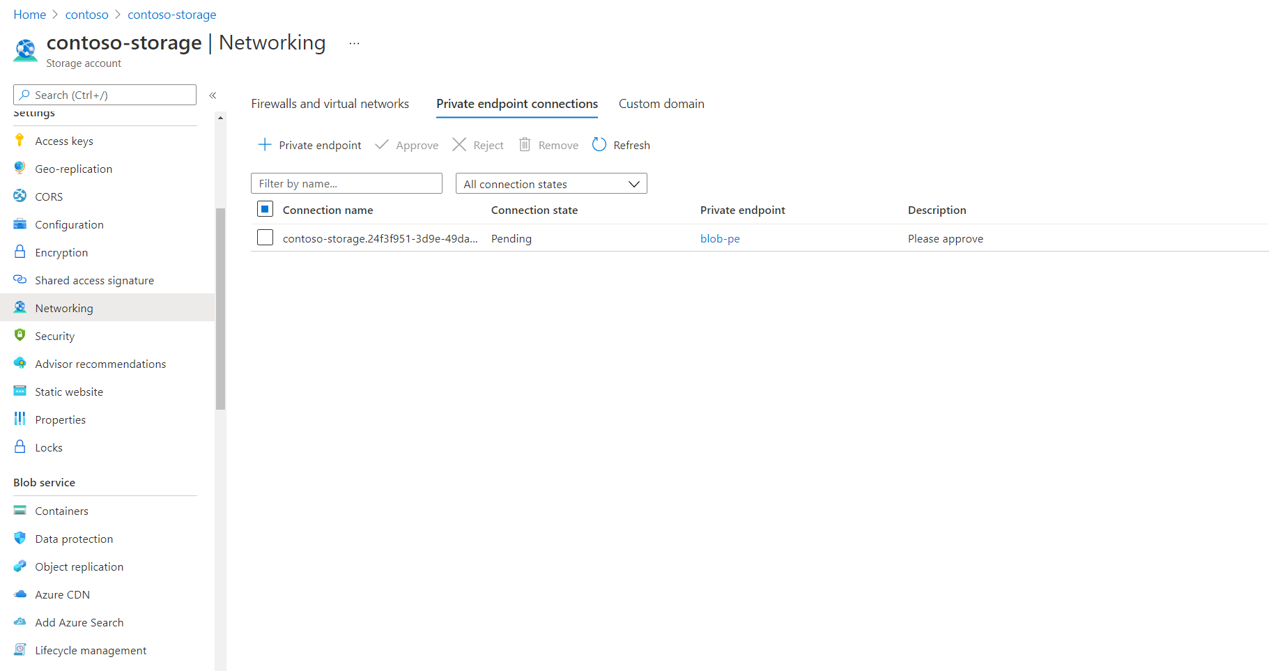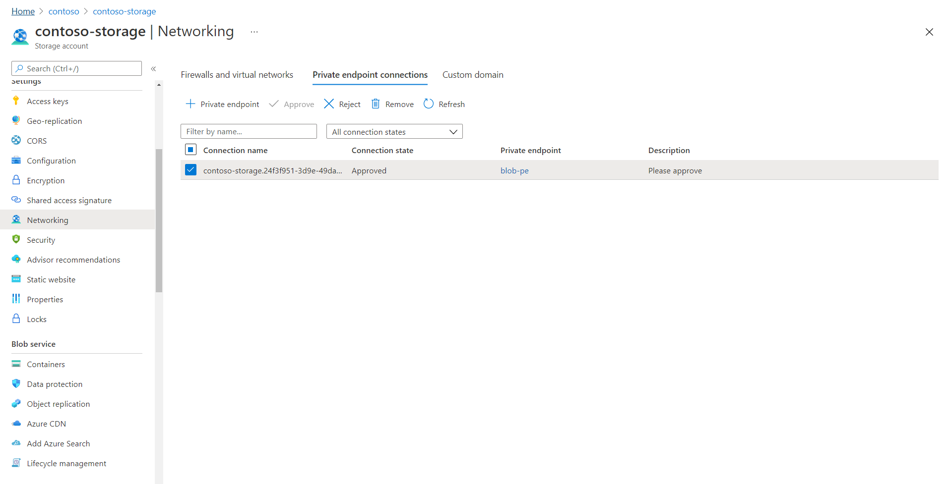 找到列出专用终结点连接的部分。 以下示例适用于存储帐户。