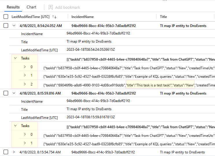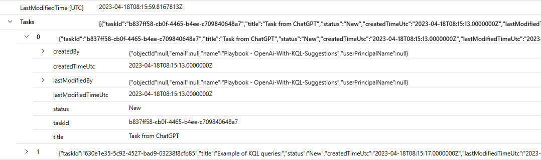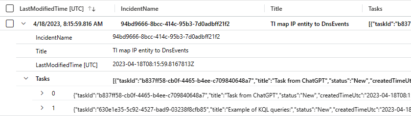 SecurityIncident | where array_length( Tasks) > 0 | where IncidentNumber == "405211" | sort by LastModifiedTime desc | project IncidentName, Title, LastModifiedTime, Tasks让我们看一下此事件的最新记录,找到与之关联的任务列表。