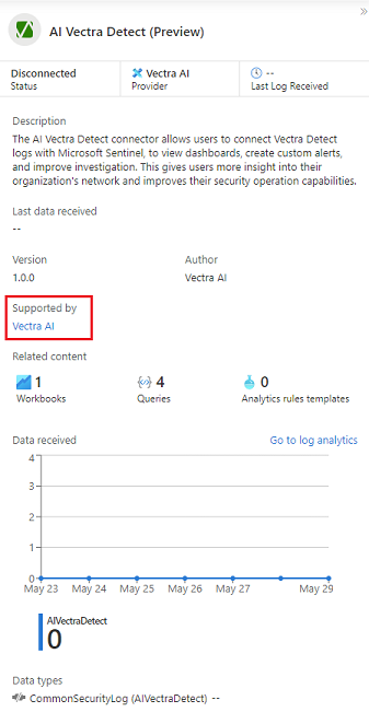Microsoft和其他组织机构都编写Microsoft Sentinel数据连接器。 在 Microsoft Sentinel 中找到数据连接器页中的支持联系人。