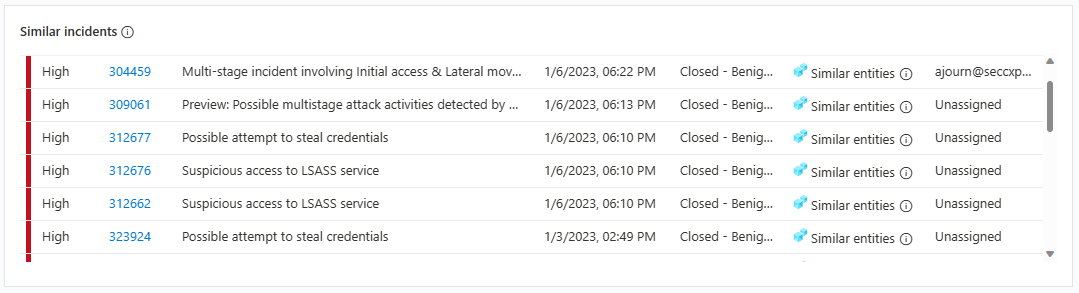 该小组件显示 20 个最相似的事件。 Microsoft Sentinel 根据常用元素(包括实体、源分析规则和警报详细信息)来确定哪些事件是相似的。 从此小组件中,可以直接跳转到其中任一事件的完整详细信息页,同时与当前事件保持连接。