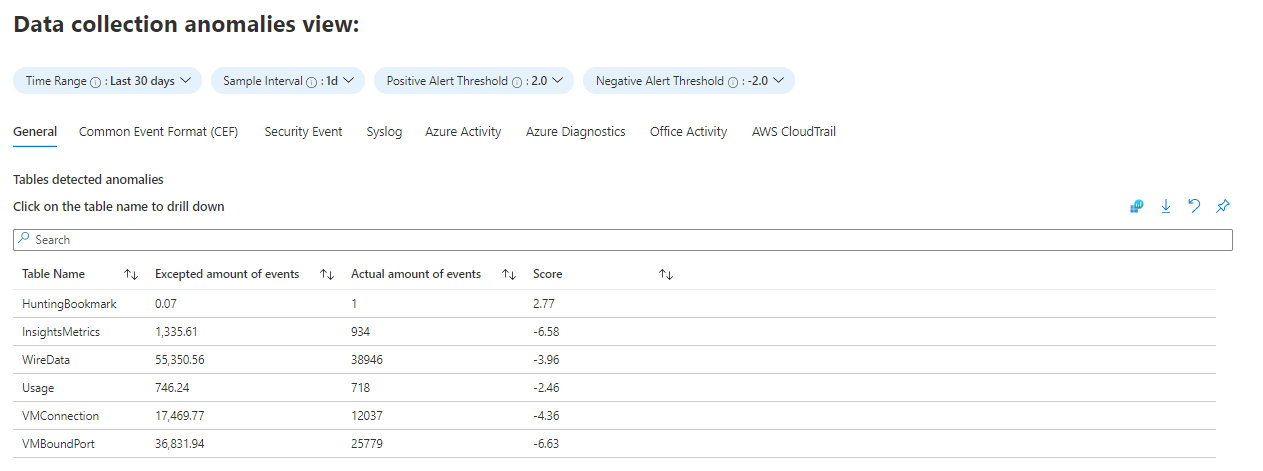 “数据收集异常”选项卡将帮助你按表和数据源检测数据收集过程中的异常。 每个选项卡都显示特定表的异常情况(“常规”选项卡包含表的集合)。 使用 series_decompose_anomalies() 函数计算异常,该函数会返回异常分数。 详细了解此函数。 为要计算的函数设置以下参数:
