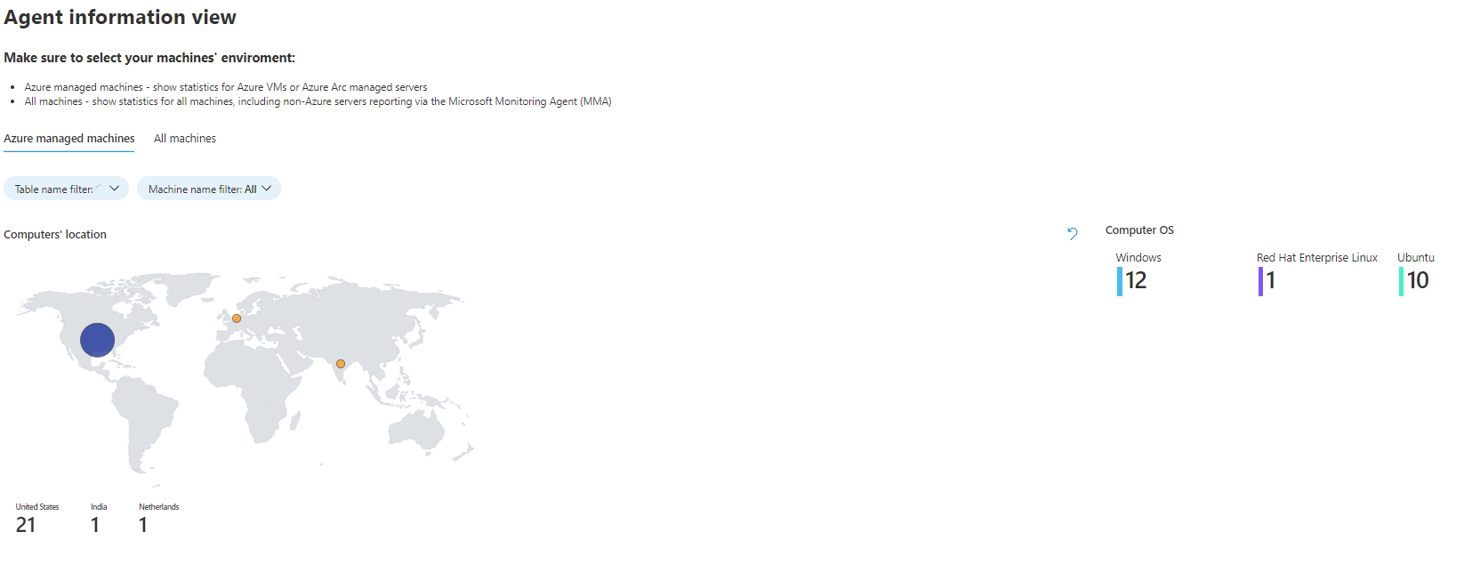 在本部分中,必须选择描述计算机环境的选项卡:如果只想查看 Azure Arc 托管的计算机,请选择“Azure 托管的计算机”选项卡;选择“所有计算机”选项卡可查看安装了 Azure Monitor 代理的托管计算机和非 Azure 计算机。