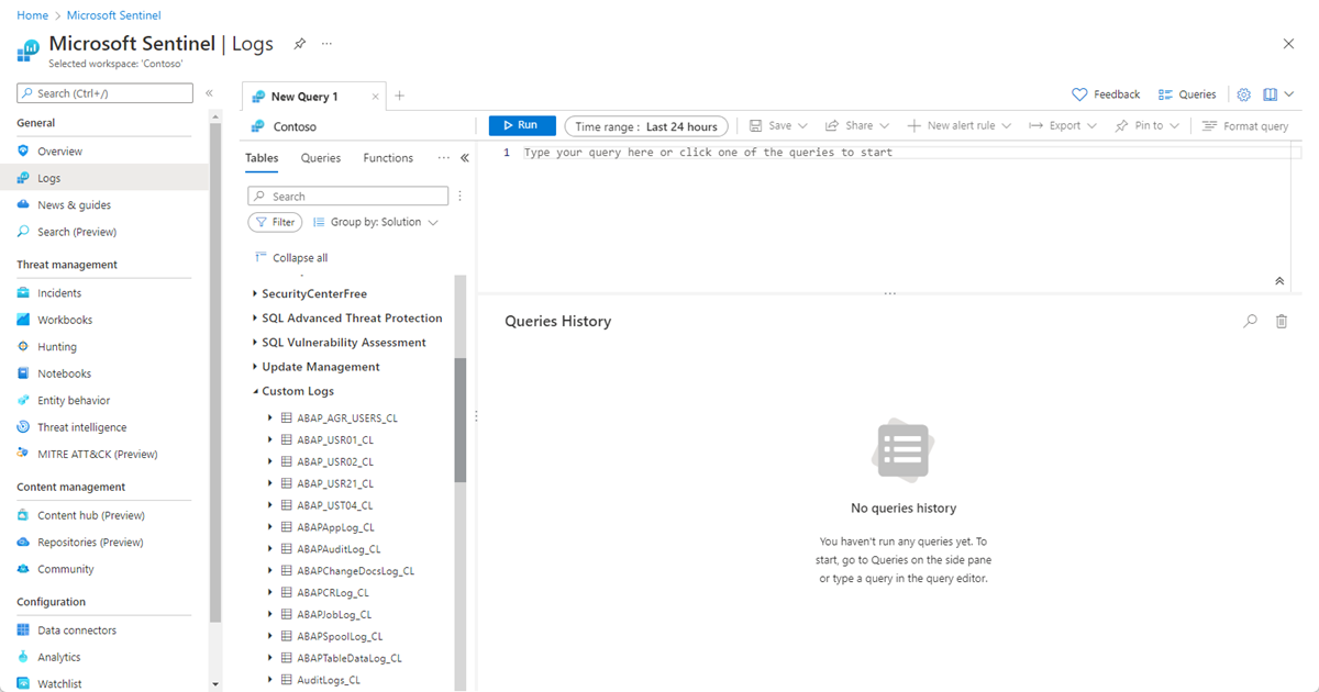 - 在执行本文中的过程之前,需要部署 SAP 数据连接器代理并将其连接到 SAP 系统。 在 SAP 系统进行连接且数据开始流式传输到 Microsoft Sentinel 中之前,SAP 日志不会显示在 Microsoft Sentinel 的“日志”页中。
