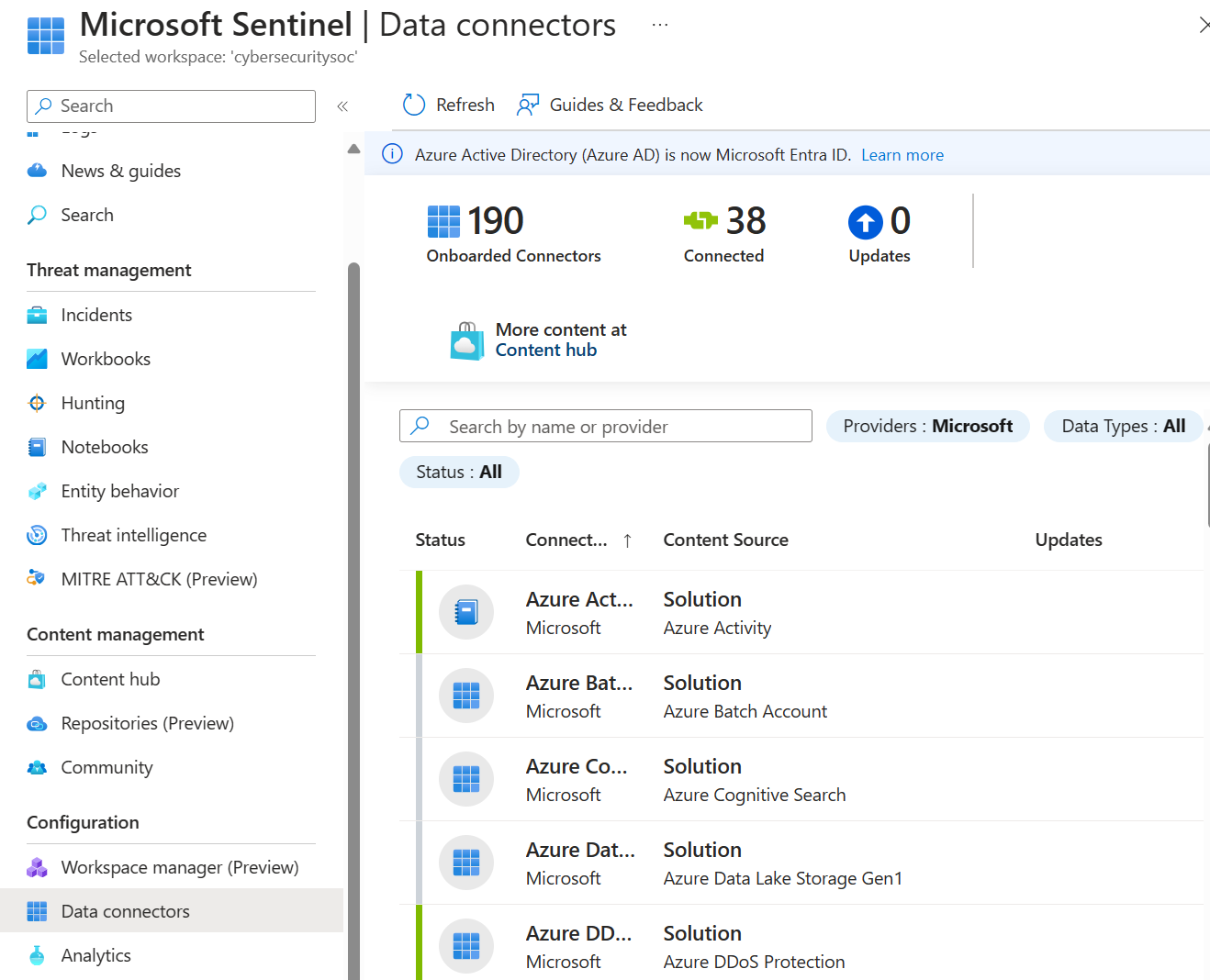 现成的数据连接器 许多连接器都打包在适用于 Microsoft Sentinel 的 SIEM 解决方案中,并提供实时集成。 这些连接器包括 Microsoft 源和 Azure 源,例如 Microsoft Entra ID、Azure 活动、Azure 存储等。