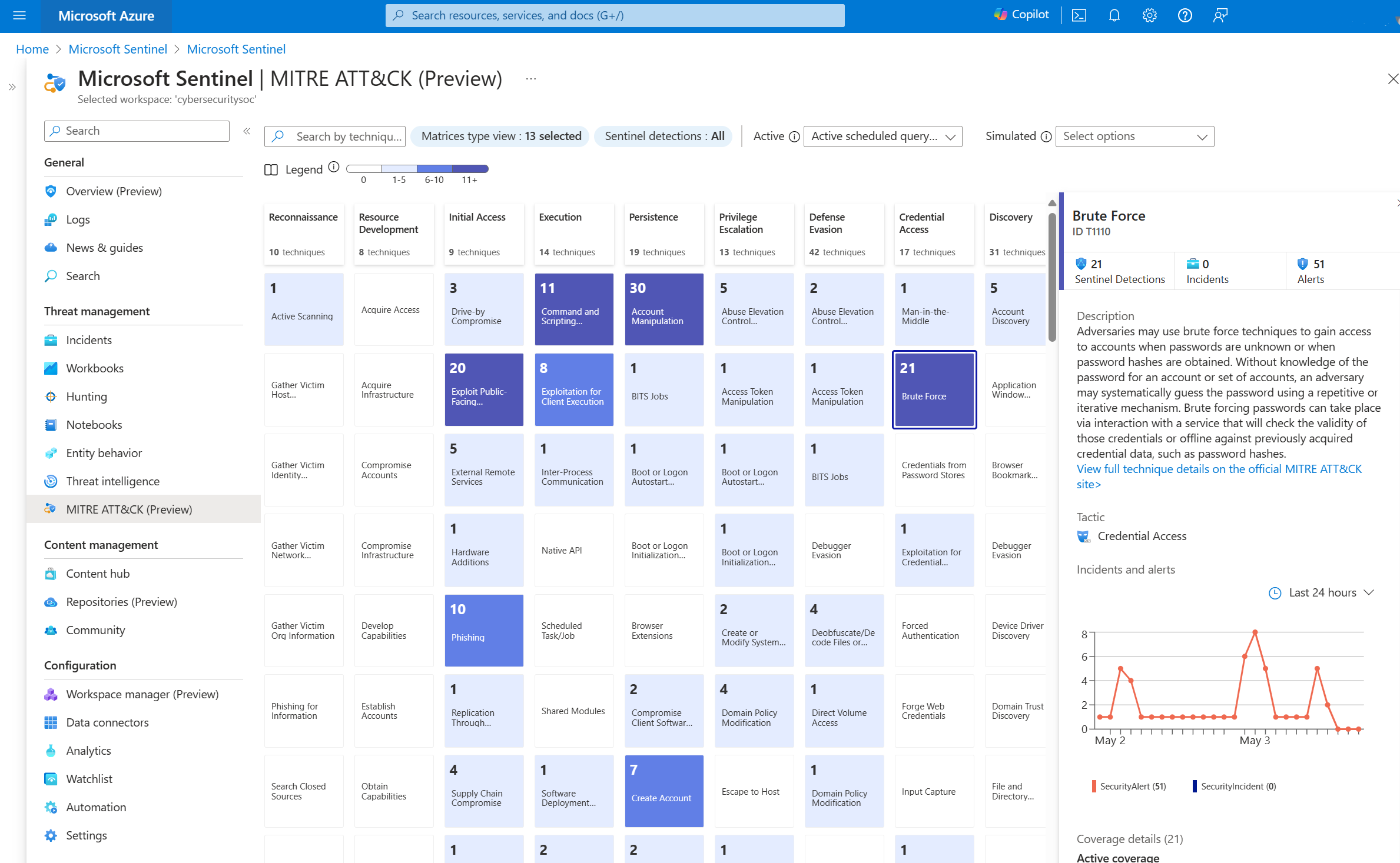MITRE ATT&CK 范围 Microsoft Sentinel 能够分析引入的数据,不仅是为了检测威胁并帮助调查,还可以根据 MITRE ATT&CK® 框架的策略和技术直观显示组织安全状态的性质和覆盖范围。