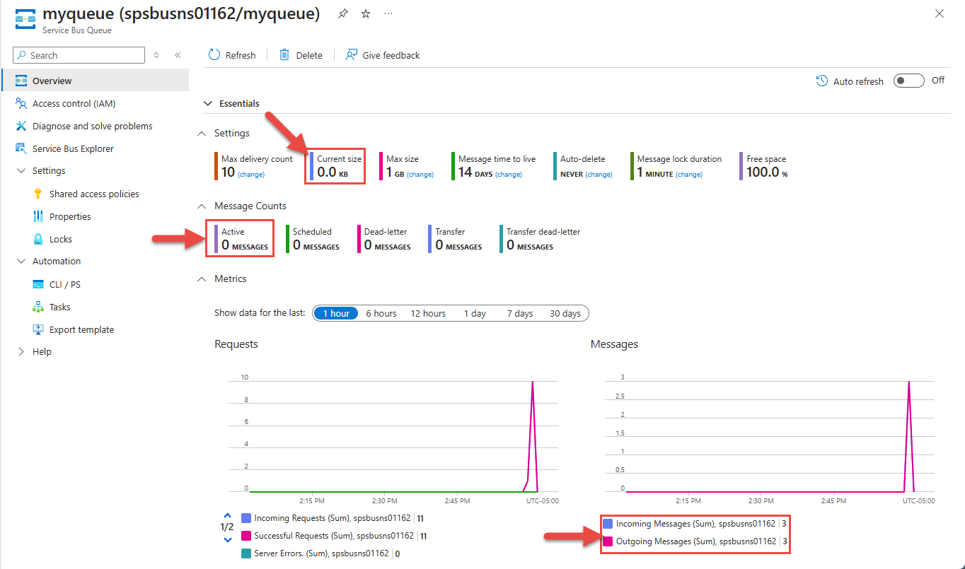- 在“消息”图表中的底部“指标”部分中,可以看到队列有三条传入的消息。