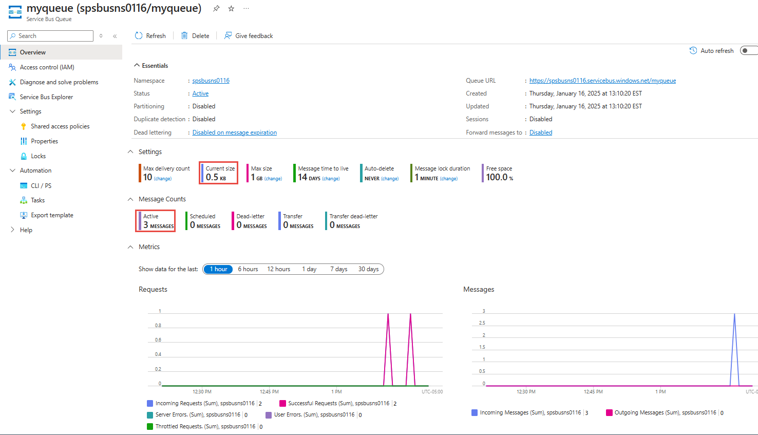- 队列的活动消息计数值现在为 3。 每次运行此发件人应用而不检索消息时,该值会增加 3。