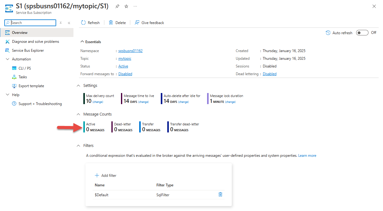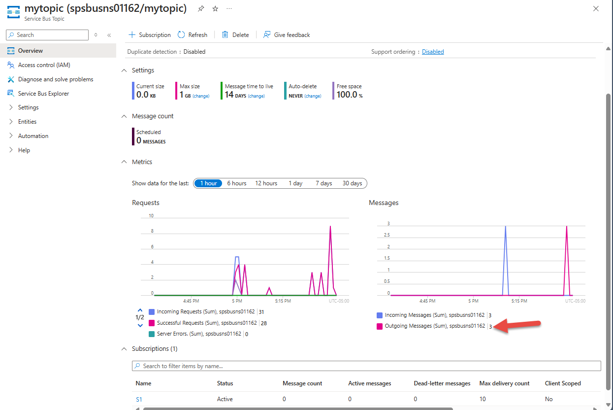 Wait for a minute and then press any key to end the processing Received: Message 1 from subscription: S1 Received: Message 2 from subscription: S1 Received: Message 3 from subscription: S1 Stopping the receiver... Stopped receiving messages再次检查门户。