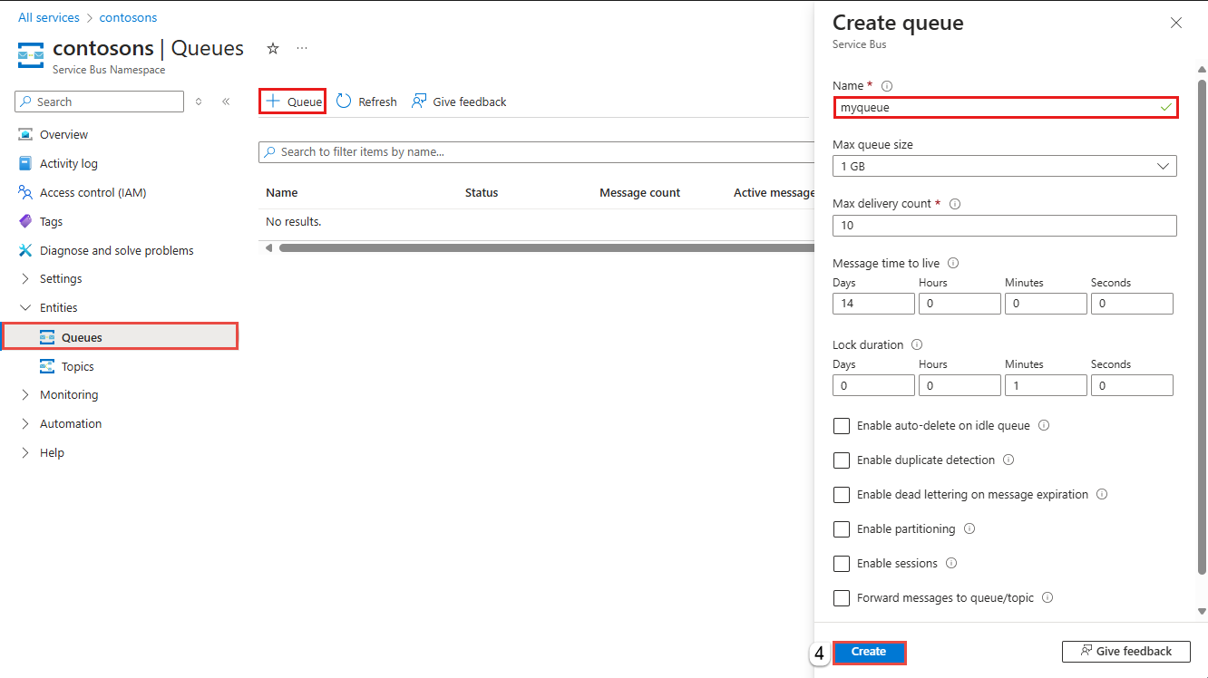 在 Service Bus Namespace 页上,展开左侧导航菜单上的 Entities,然后选择 Queues。
