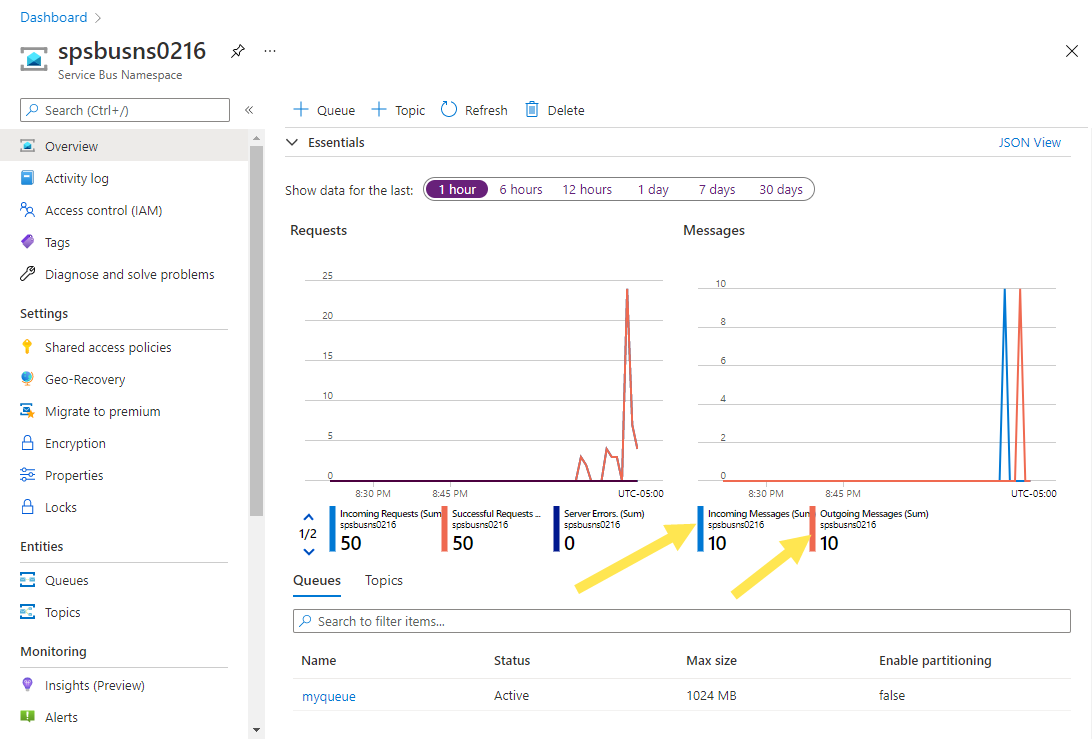 在 Azure 门户中Service Bus命名空间的 Overview 页上,可以看到传入和 outgoing 消息计数。 等待一分钟左右,然后刷新页面以查看最新值。
