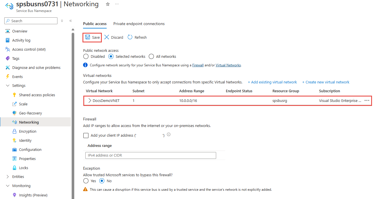 如果你在此页上选择了“所选网络”选项并且未添加至少一个 IP 防火墙规则或虚拟网络,则可以通过公共 Internet(使用访问密钥)访问该命名空间。