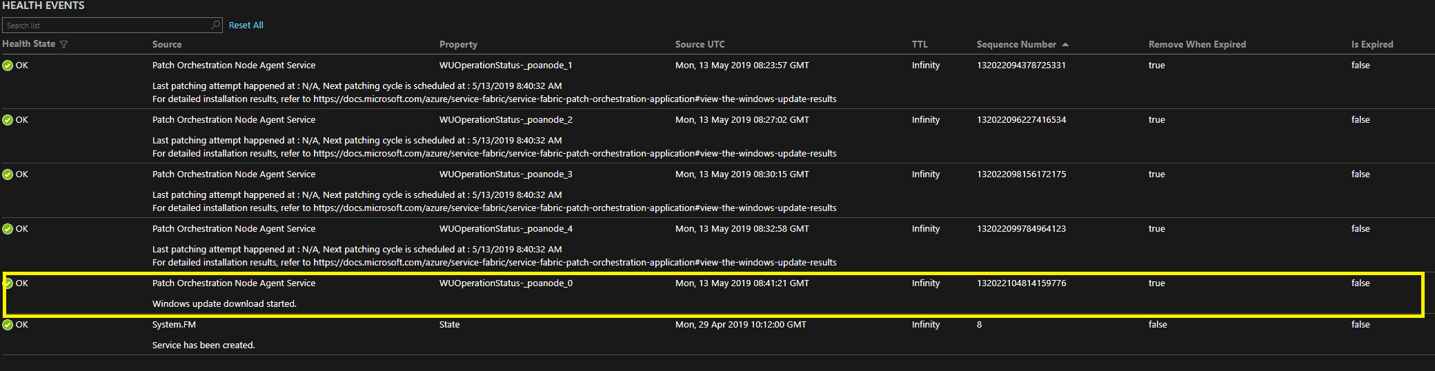在这种情况下,将针对节点代理服务生成警告级别的运行状况报告。 Windows 更新结果也包含可能的失败原因。