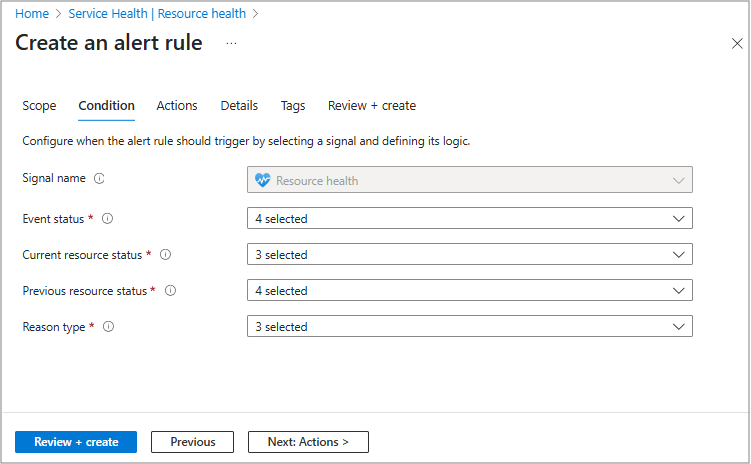 使用此选项卡选择触发警报所需的内容。 你可以将其设置为监视资源健康状况(如不可用或性能下降)、事件状态(活动或已解决)甚至特定原因类型(平台操作与用户操作)的更改。