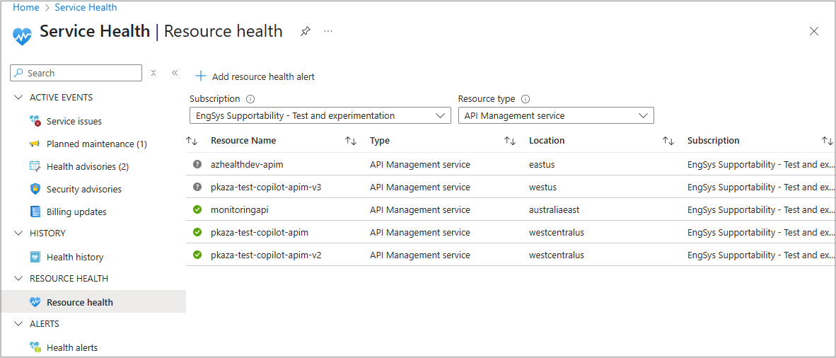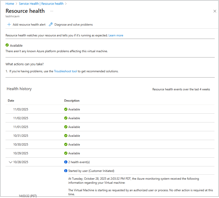 Azure 资源运行状况有助于在服务问题影响到 Azure 资源时进行诊断和获取支持。 它报告资源的当前和过去状态。