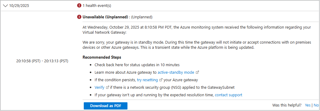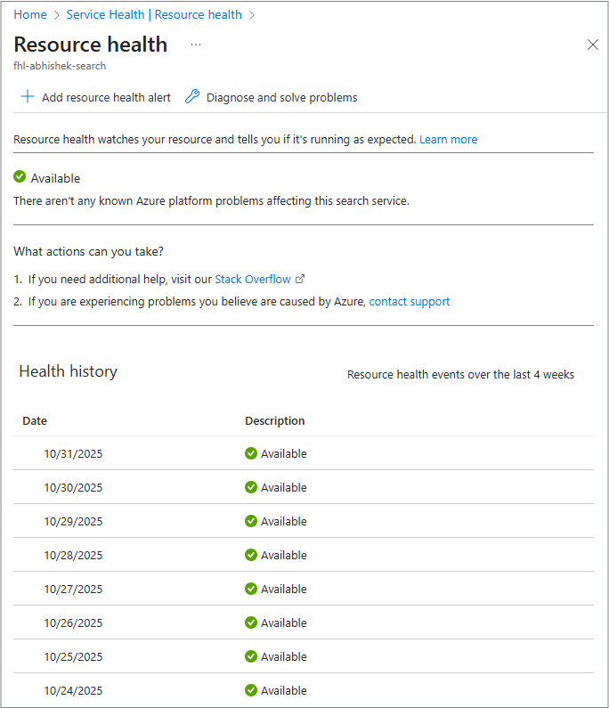 “可用”表示服务尚未检测到影响资源运行状况的事件。 如果资源在过去 24 小时内从计划外停机中恢复,则会看到“最近解决”通知。