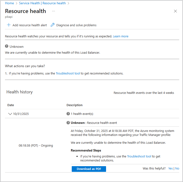 如果资源运行不正常,资源运行状况将分析其他信息以确定问题根源。 根据它报告的Microsoft正在采取的措施来解决问题,并识别您可以采取的行动来解决该问题。