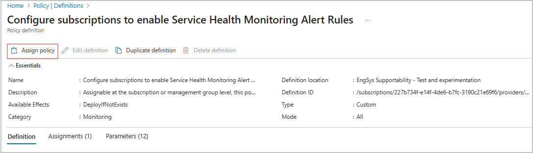 - 确保策略定义包含 配置订阅以启用服务运行状况监视警报 规则。 还可以根据需要更新分配名称和说明。