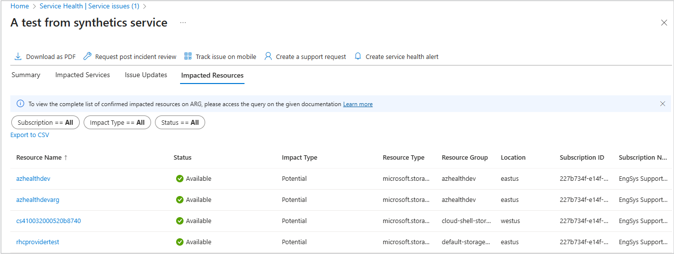 | 受影响的资源 | 受此服务问题影响的资源。 选择 “查看详细信息 ”链接以打开“受影响的资源”选项卡以获取更多详细信息。 |