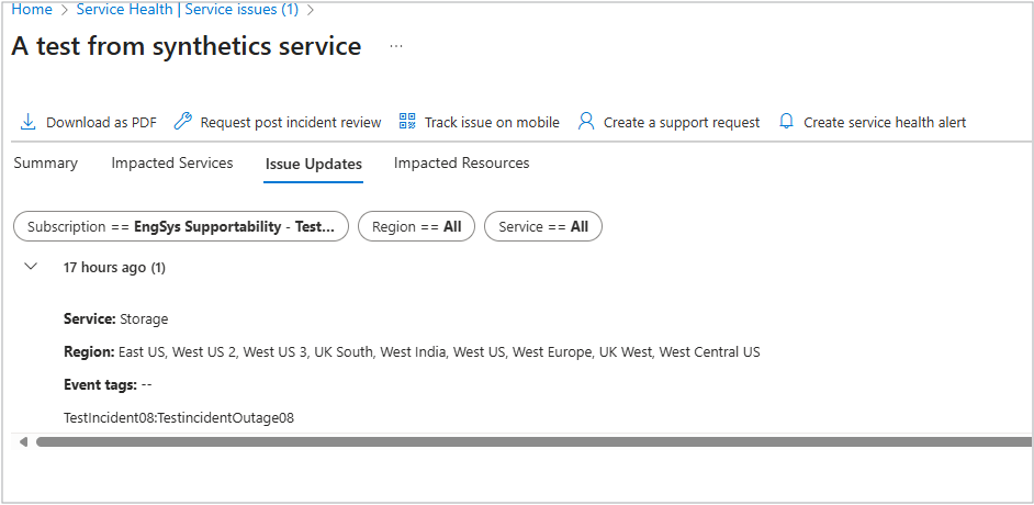 - 请求事件后评审:选择此按钮可打开一个窗口以开始创建服务运行状况警报,可在其中收到事件后评审(PIR)(如果可用)。