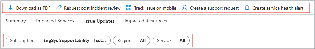 | 上次更新时间 | Azure Service Health 中最新更新的时间戳。 选择“ 查看所有更新 ”链接以打开“问题更新”选项卡以获取更多详细信息。 |