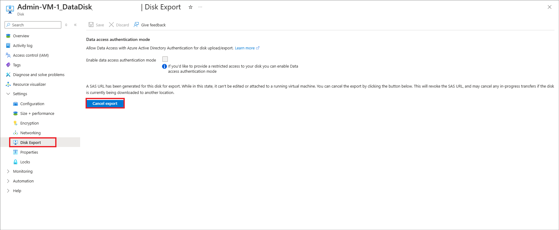 转到磁盘的“设置”下的“磁盘导出”选项卡。 默认情况下,磁盘应具有 Azure Site Recovery 的 SAS 访问权限。