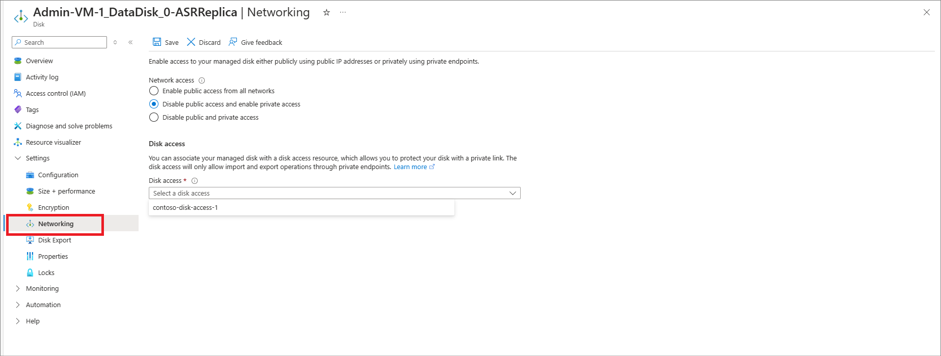 Azure Site Recovery 会创建副本磁盘和目标磁盘。 副本磁盘是存有复制数据的磁盘,而目标磁盘是连接到故障转移(或测试故障转移)虚拟机的磁盘。 Azure Site Recovery 会创建启用了公共访问的磁盘。 不过,可按照以下步骤手动禁用这些磁盘的公共访问: