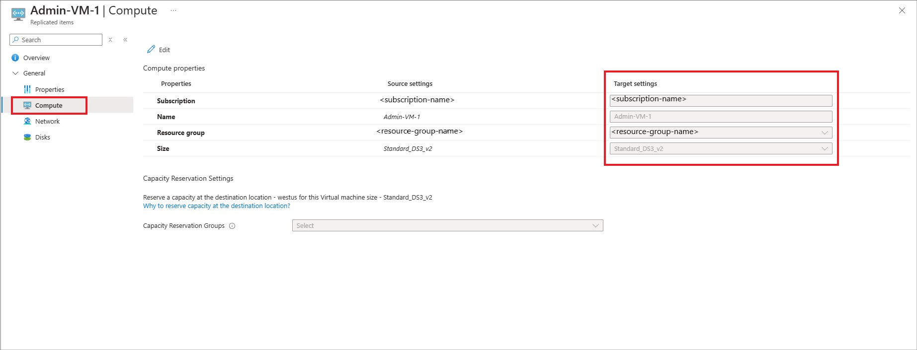 在“计算”选项卡中查找目标订阅名称和目标资源组名称。副本磁盘位于目标订阅和目标资源组中。 故障转移和测试故障转移虚拟机也在目标订阅的目标资源组中创建。
