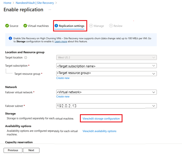 此功能在所有支持 Azure Site Recovery 和提供高级 Blob 存储帐户的区域中均可用。 在受支持的区域之外的任何其他区域中使用“高变动率”时,复制和/或重新保护可能会失败。
