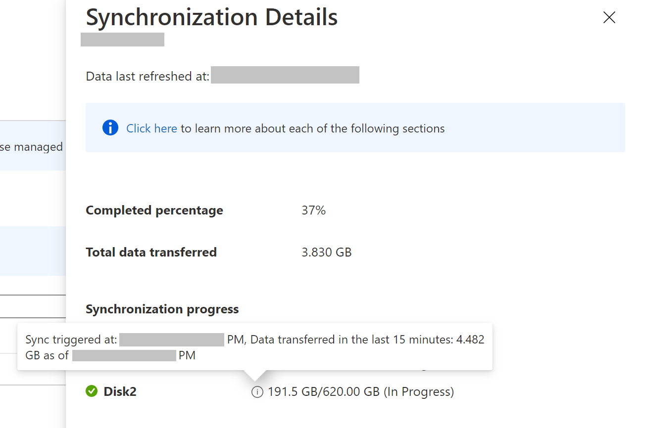 - 针对磁盘选择信息气球时,可以看到有关为磁盘触发复制(同步)的时间、过去 15 分钟内传输到Azure的数据以及上次刷新的时间戳的详细信息。 此时间戳显示Azure服务从源计算机接收信息的最新时间。