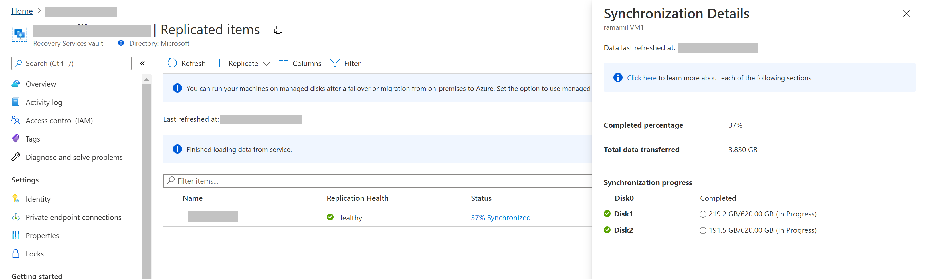若要跟踪初始复制的进度,请转到Azure portal中的恢复服务保管库。 在复制的项下,监视复制项的“状态”列值。 状态显示初始复制完成情况的百分比。 将鼠标悬停在“状态”上时,会看到“已传输的总数据”。 选择状态时,上下文页面将打开并显示以下参数: