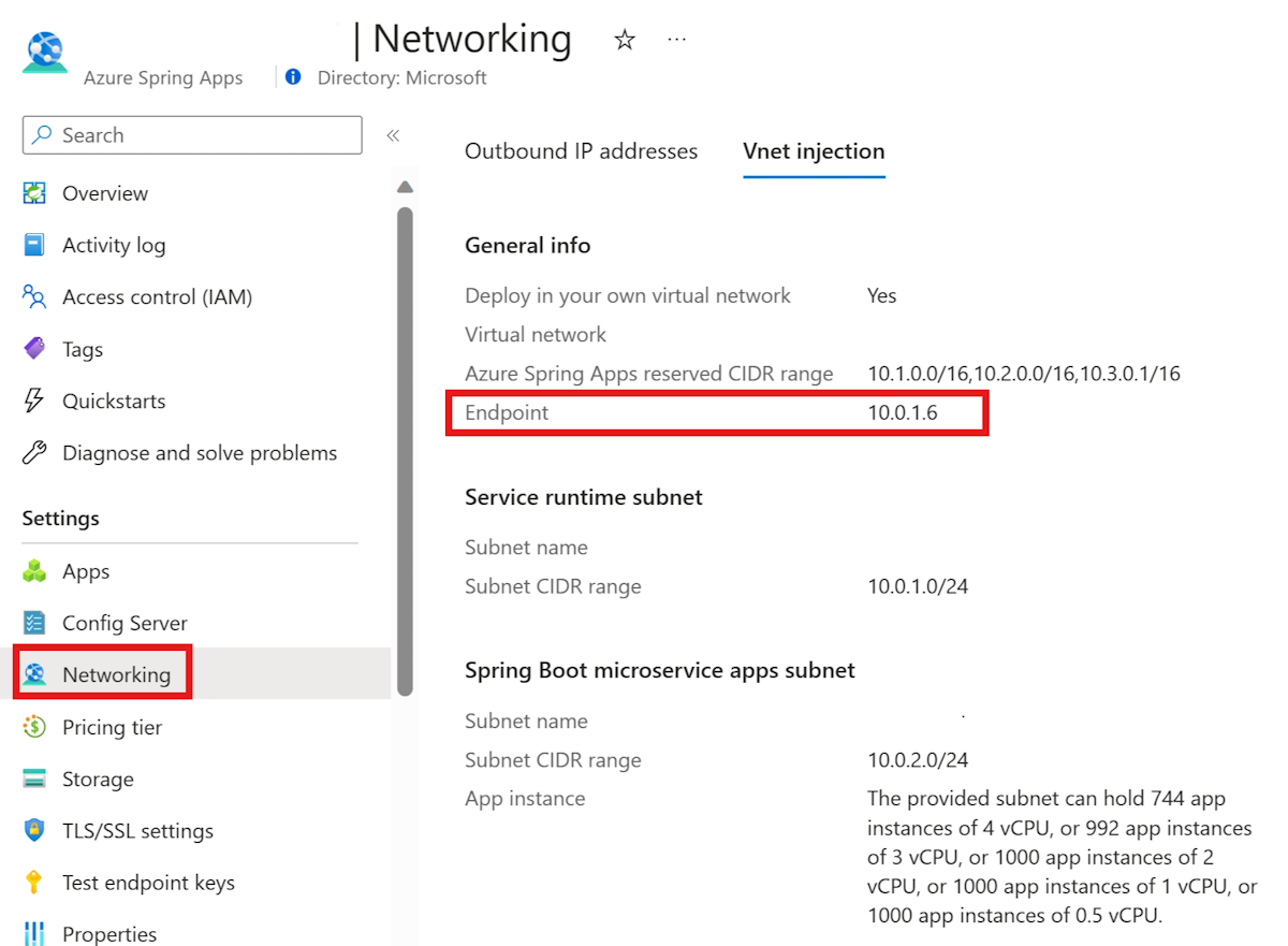 在虚拟网络中部署的 Azure Spring Apps 服务实例的应用程序上分配终结点时,该终结点使用专用的完全限定的域名 (FQDN)。 只能在专用网络中访问该域。 应用和服务使用应用程序终结点。 其中包括在 Azure Spring Apps 中设置过渡环境中的查看应用和部署部分内所述的“测试终结点”。 “日志流式处理”(如实时流式传输 Azure Spring Apps 应用日志中所述)也仅可在专用网络中进行。