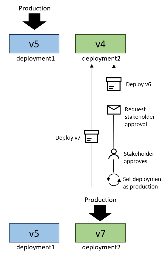 假设在以上应用程序中,发布管道需要手动审批,然后应用程序的每个新版本才能接收生产流量。 这造成了以下风险:当一个版本 (v6) 在过渡部署上等待手动审批时,部署管道会再次运行,并用更新的版本 (v7) 覆盖该版本。 然后,在批准 v6 后,部署了 v6 的管道会将过渡部署设置为生产部署。 但现在,该版本是未批准的 v7,而不是已批准的、已在该部署上部署的并接收流量的 v6。