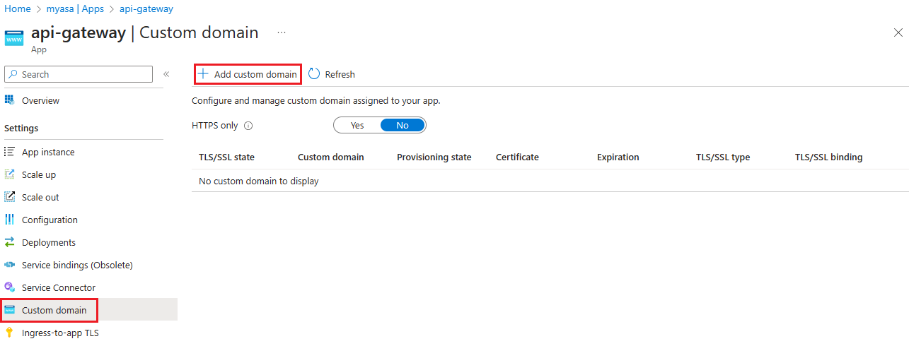 在应用页上的导航窗格中,选择“自定义域”。 然后,将 HTTPS 仅限设置为