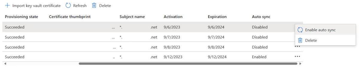 显示证书列表的 Azure 门户屏幕截图,其中省略号按钮菜单处于打开状态且已选中“启用自动同步”选项。