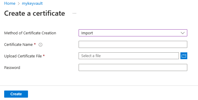 6. 在“密码”下,如果你要上传受密码保护的证书文件,请在此处提供该密码。 否则,请将其留空。 成功导入证书文件后,密钥保管库会删除该密码。