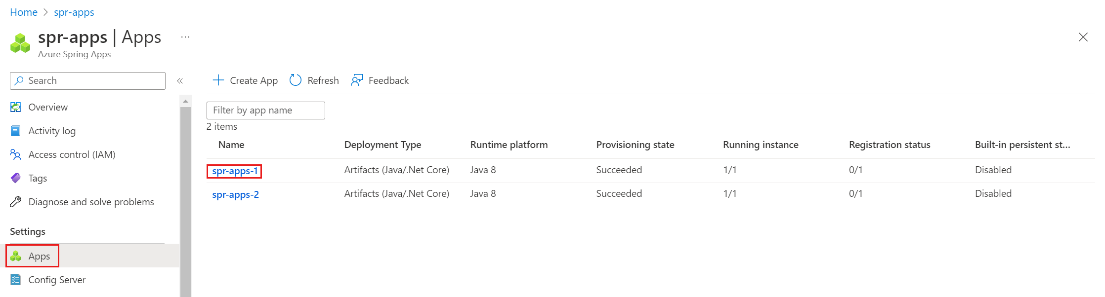 az spring storage list-persistent-storage命令列出所有相关应用程序。 - 重新生成