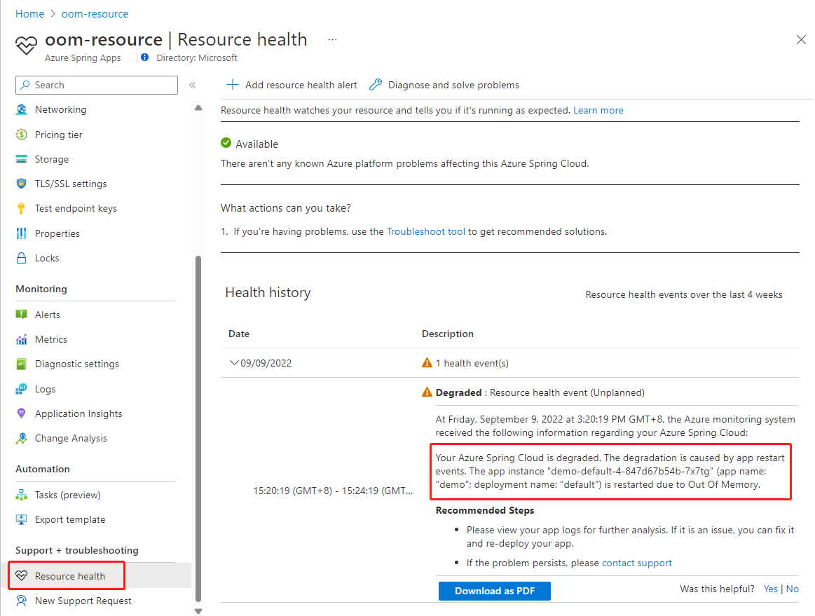 Azure 门户上的“资源运行状况”页面显示了容器 OOM 导致的应用重启事件,如以下屏幕截图所示: