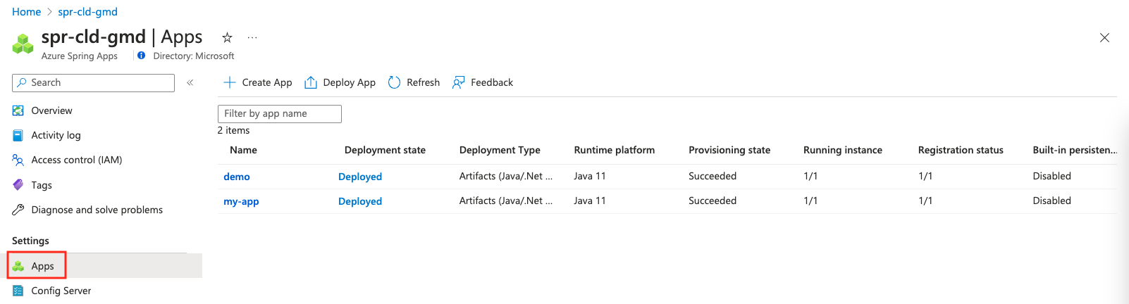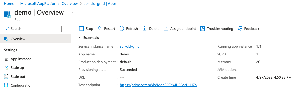 az spring app create \ --resource-group <resource-group-name> \ --service <Azure-Spring-Apps-instance-name> \ --name demo \ --runtime-version Java_17 \ --assign-endpoint将应用部署到 Azure Spring Apps: