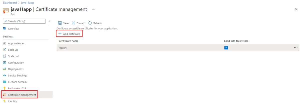 FileInputStream is = new FileInputStream("/etc/azure-spring-cloud/certs/public/<certificate name>");