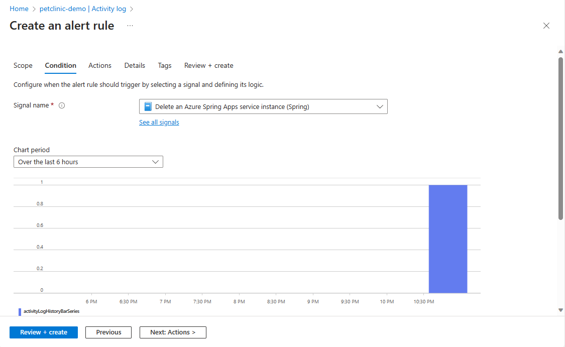 选择“操作”选项卡。添加要应用于警报规则的操作组。