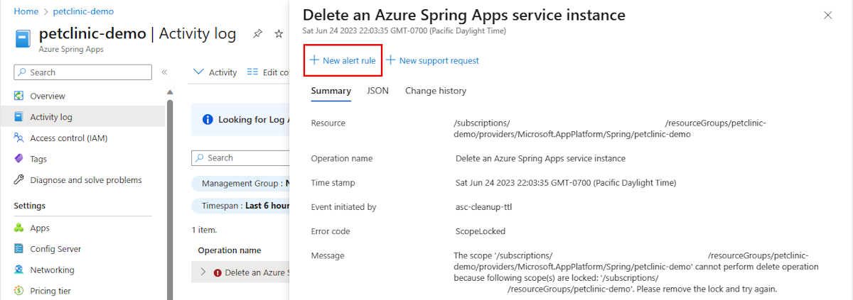 导航到 Azure Spring Apps 实例,然后在导航窗格中选择“活动日志”。