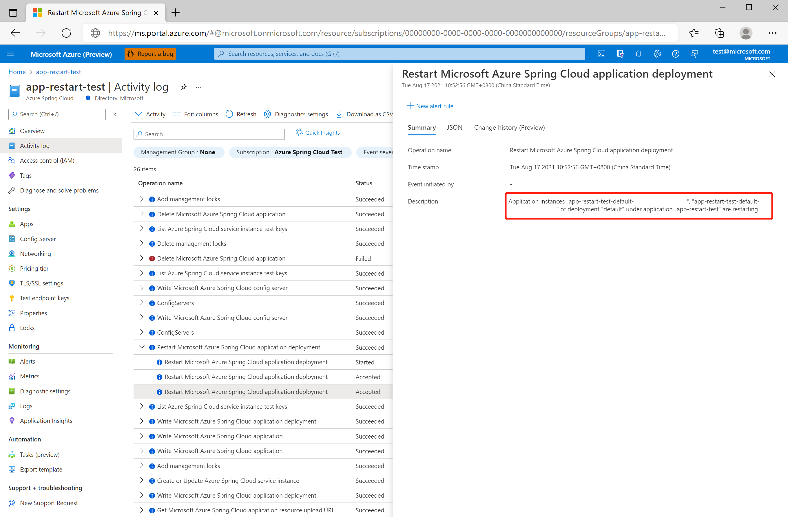 要在重启应用时查看受影响的实例,请在 Azure 门户中导航到 Azure Spring Apps 实例,然后在导航窗格中选择“活动日志”。