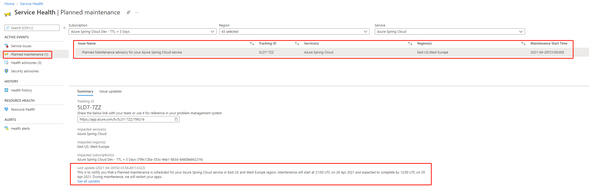目前,Azure Spring Apps 每 2-4 个月执行一次定期计划内维护,以便升级基础 Kubernetes 版本。 有关详细的维护时间线,请查看“Azure 服务运行状况”页上的通知。