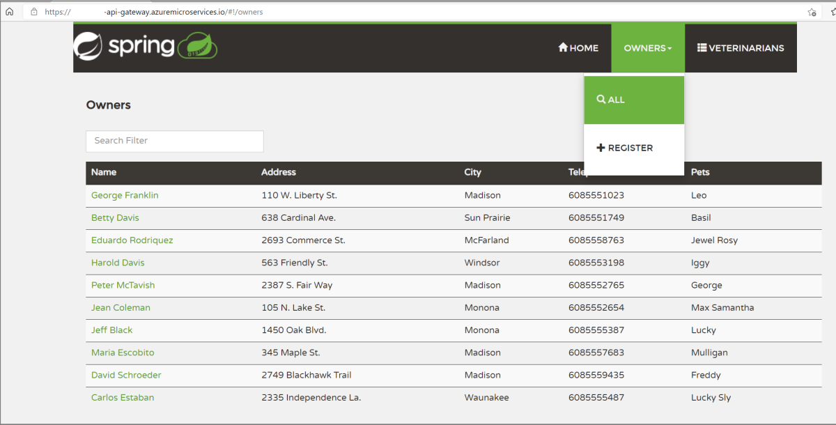 使用前面显示的“公共 URL”(格式为 api-gateway)从浏览器访问 customers-service 和 https://<service name>-api-gateway.microservices.azure.cn。