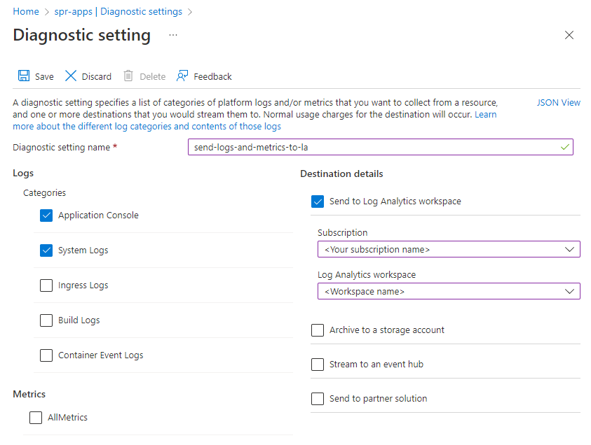 - 日志>类别:选择ApplicationConsole和SystemLogs。 有关日志类别和内容的详细信息,请参阅 Azure Monitor 中的诊断设置。