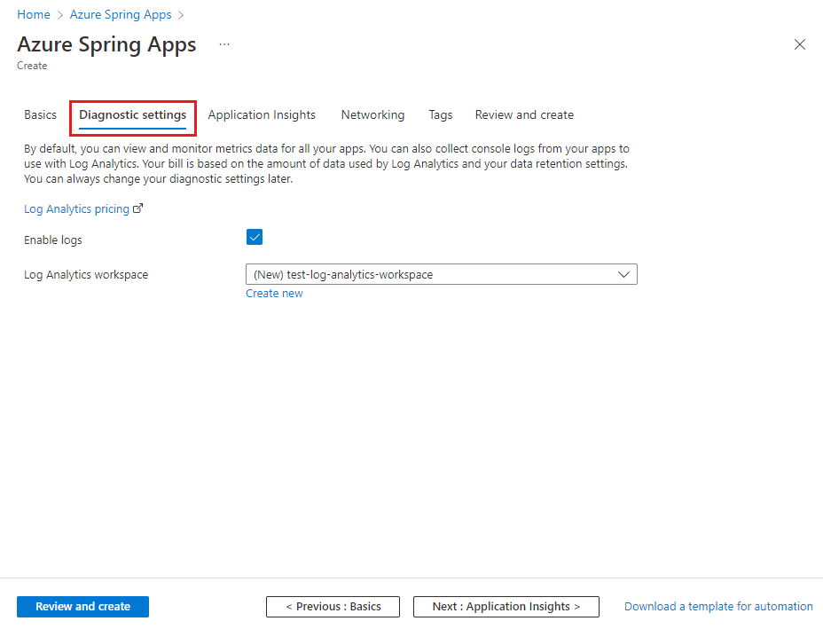在创建 Azure Spring Apps 服务实例的向导中,可以使用现有的工作区或创建一个工作区来配置“Log Analytics 工作区”字段。