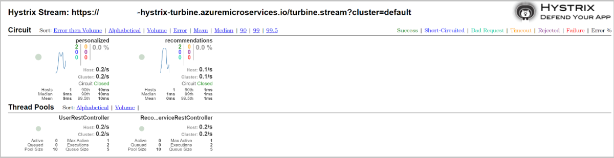 也可以从 test-endpoint 访问 Hystrix 指标流。 作为后端服务,我们没有为 recommendation-service 分配公共终结点,但我们可以在 https://primary:<KEY>@<SERVICE-NAME>.test.microservices.azure.cn/recommendation-service/default/actuator/hystrix.stream 使用 test-endpoint 显示其指标