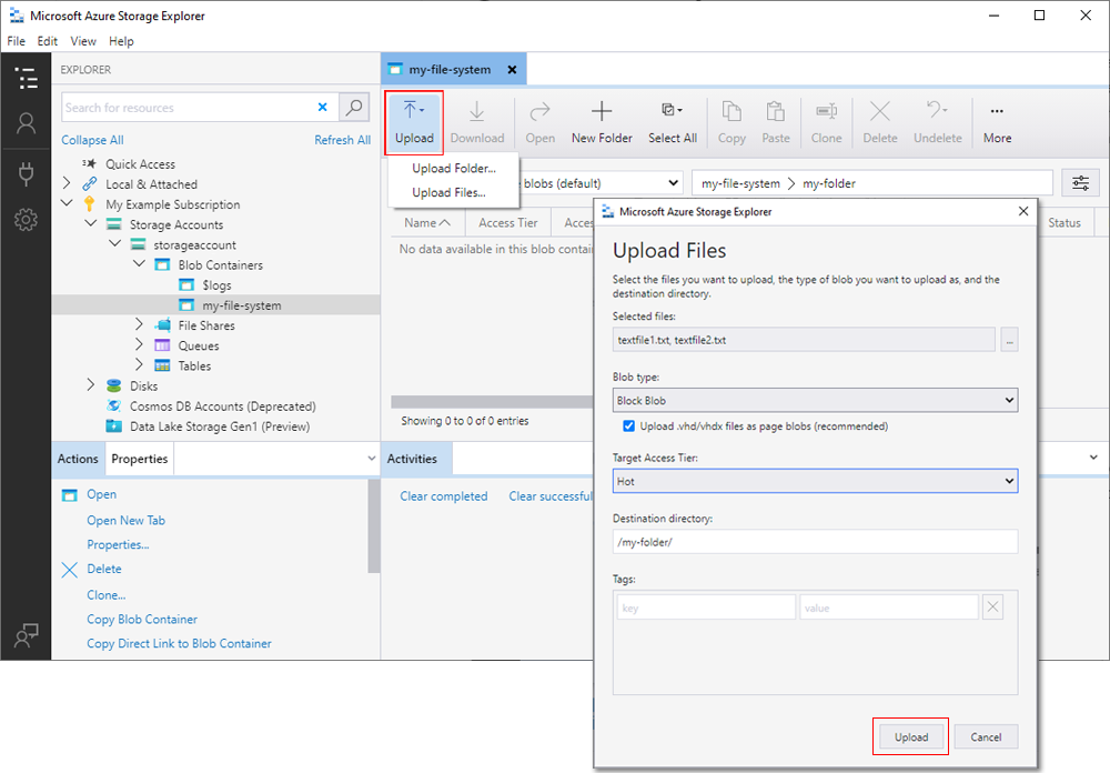 在目录功能区上,选择“上传”按钮。 此操作提供上传文件夹或文件的选项。